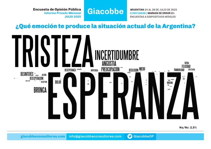 La encuesta destaca una alta desilusión ciudadana, especialmente hacia el peronismo, lo que podría derivar en baja participación electoral en septiembre. A pesar del pesimismo generalizado, la palabra que predomina entre los encuestados es “esperanza”, vinculada principalmente a Milei.