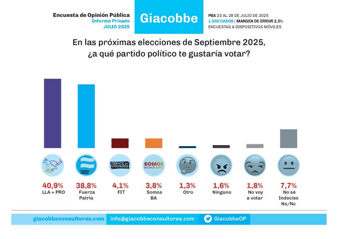 Una reciente encuesta de Giacobbe Consultores, realizada entre el 24 y 28 de julio de 2025, revela un escenario político muy polarizado de cara a las elecciones presidenciales. Según el estudio, Javier Milei lidera con un 40,9% de intención de voto, seguido muy de cerca por la fuerza peronista, con un 38,8%. La diferencia entre ambos es mínima, dejando la puerta abierta a una disputa muy reñida en los próximos comicios.
